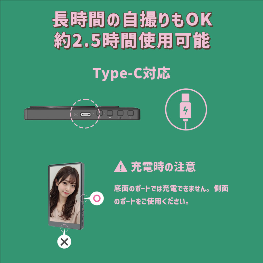 スマホの外カメラ映像を手元のモニターで確認できるから、表情や構図をチェックしながら、理想の1枚をしっかり残せます。軽量で持ち運びやすく、Type-C充電にも対応。ちょっと離れた位置からでも、自然に撮影できる便利な機能も搭載しています。旅行、自撮り、カフェタイム、推し活など、毎日の“盛れ瞬間”をもっとキレイに、もっと自由に。