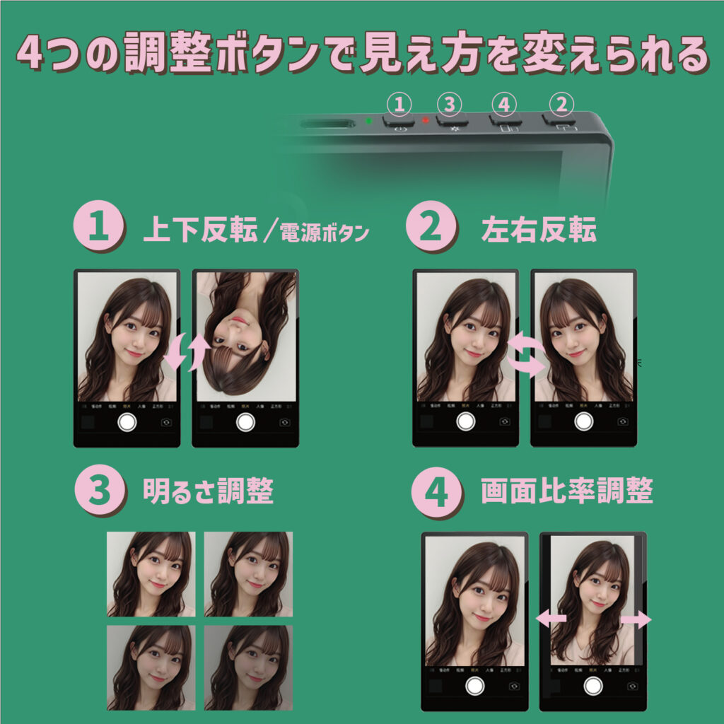 明るさ調整ボタン×1 / 画面比率調整ボタン×1(1:1及びフルスクリーン)/
