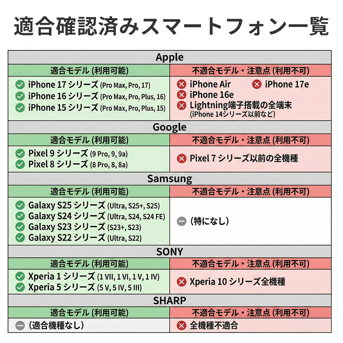 ・主な非対応機種: Lightning端子のiPhone、iPhone 16e、iPhone Air、Google Pixelシリーズ、SHARP製スマートフォン全般、Galaxy Aシリーズ、OPPO Reno Aシリーズ など